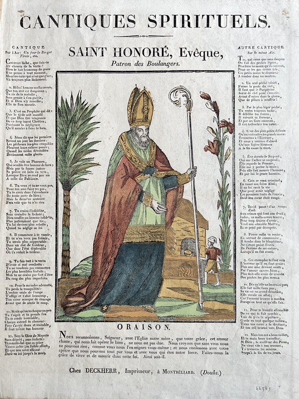 Portrait en pied de saint Honoré gravé sur bois au pochoir, encadrée de texte imprimé sur deux colonnes. Le Saint est figuré en tenue d’évêque, à l’arrière-plan un boulanger et son fournil. Il fut actif principalement à Montbéliard mais également à Porrentruy Théodore-Frédéric Deckherr reprend la librairie et l’imprimerie de son père en 1803, et continue l’activité avec ses frères de 1812 à 1833. Les frères se séparent en 1833 et abandonnent en 1839 l’imagerie populaire. Les productions de Montbéliard utilisent fréquemment la couleur orange minium qui égaient leurs images.