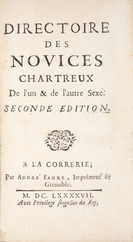 Rare impression de La Grande Chartreuse sortie des presses de Laurens Gilibert, le premier imprimeur à l’adresse de La Correrie. Première édition française des statuts des chartreux (troisième partie) traduits du latin et établis par Innocent Le Masson : 1. Statuts suivis du Directoire des Frères laïques de l’Ordre des Chartreux 2. Traité de l’Oraison intérieure, ou Direction pour en faciliter l’usage 3. Cérémonial des Frères laïques de l’ordre des Chartreux. « Le Chapitre général ayant ordonné qu’on ferait imprimer en langue vulgaire la Troisième Partie des Statuts, qui contient vos observances, nous avons pris soin de la faire imprimer avec le plus d’exactitude que nous avons pu ; nous y avons ajouté un Directoire et un Cérémonial (…) En Chartreuse ce 12 mars 1683 » (Le Masson). Cette partie comprend, sans qu’on y ait apporté d’autres modifications que de les traduire, les vingt-trois chapitres qui se trouvaient déjà dans les deux premières éditions de la Nova Collectio (statuts des chartreux) imprimées en 1582 puis 1681 – cette seconde édition fut ainsi le tout premier imprimé sortie des presses de La Correrie. Dom Innocent Le Masson (1627-1703), général de la Chartreuse de La Correrie à partir de 1675, avait pris l’initiative d’y installer des presses qu’il confia à Laurent Gilibert, imprimeur juré de Grenoble, d’où sortirent des ouvrages liturgiques cartusiens mais aussi les principaux ouvrages spirituels du frère Le Masson. L’imprimerie cessa son activité vers 1700, trois années avant la mort de son maître d’oeuvre en 1703. Cachets anciens de congrégations sur le titre dont les Lazaristes de Dax ; ex-libris « M. Redon, supérieur des Lazaristes à Tours » ; ex-libris manuscrit ancien à l’encre brune « Frère Charles » sur la garde supérieure. Trace de mouillure à la fin du volume. Deschamps, 366-367 ; Magnien, Presses de la Correrie, 1896 ; Hubert Élie, Les Éditions des Statuts de l’ordre des Chartreux, 1943, p. 139 sq.