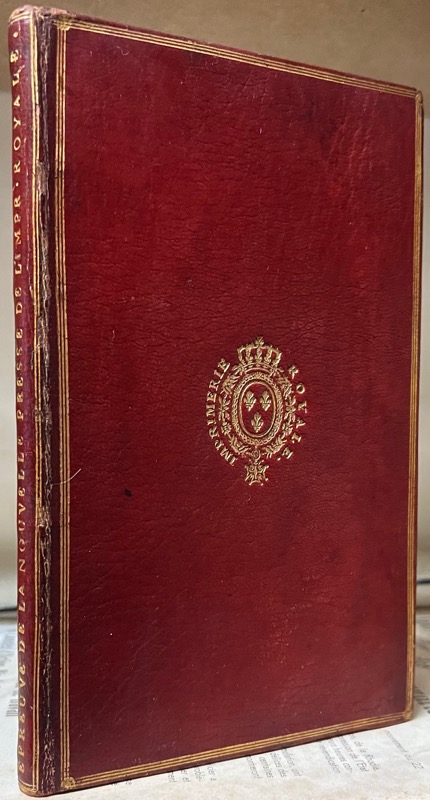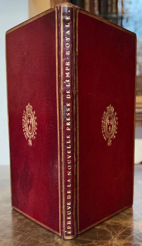 In-8 (199 x 120 mm) de (4)-49 pp., maroquin rouge, titre en long sur le dos « ÉPREUVE DE LA NOUVELLE PRESSE DE L’IMPR. ROYALE » encadré d’un double filet doré, triple filet doré d’encadrement sur les plats armes royales serties de la mention « Imprimerie royale », roulette dorée sur les coupes, dentelle intérieure, doublures et gardes de moire bleue, tranches dorées (reliure de l’époque).