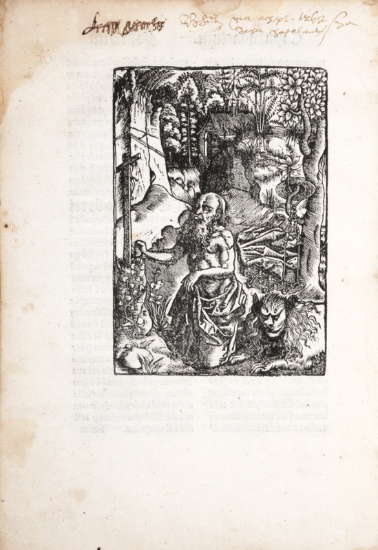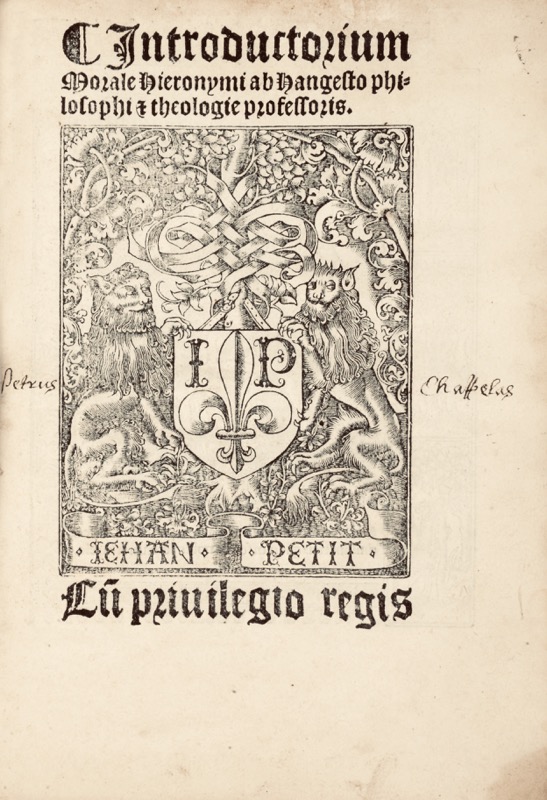 Belle impression sur deux colonnes sortie des presses de Jean de Gourmont pour Jehan Petit auquel le privilège royal fut accordé une première fois le 24 juillet 1515, reconduit à partir du 10 septembre 1519. Titre gravé sur bois avec la marque typographique de Jehan Petit (Renouard, Marques, n° 891) ; lettrines gravées sur bois (celle du recto du feuillet A2 aux armes du dédicataire) et caractères typographiques de Jean de Gourmont d’après Moreau ; figures gravées sur bois au verso du feuillet A1 (saint Jérôme), au recto du feuillet A4 (descente de Croix), et au verso du feuillet T8 (saint Jérôme répété sans encadrement). Épître dédicatoire de l’auteur à Joannes Gosthon de Zelesthe. Figure importante de l’Université de Paris durant la première moitié du XVIe siècle, Jérôme de Hangest (v.1480-1538) étudia les arts au collège de Reims, où il a pour maître Jean Tartaret (†1522), et on peut supposer qu’il obtient sa maîtrise en 1502 ou 1503. Il commence à enseigner les arts au Collège de Reims, et en même temps poursuit ses études de théologie au Collège de Sorbonne (1507). Licencié (26.I.1514) et Docteur (22.III.1514) en théologie. La même année, au mois d’août 1514, il fait partie des théologiens qui censurent l’oeuvre de l’humaniste allemande Johannes Reuchlin (1455-1522), ce qui lui vaudra une réputation de gardien de l’orthodoxie. Il enseigne ensuite la théologie et poursuit ses activités dans le domaine de la censure. Vers 1522, le cardinal Louis de Bourbon (†1535), devenu évêque du Mans (1519), le nomme chanoine de la cathédrale du Mans, puis scholasticus et finalement vicaire général. La charge est prestigieuse, Hangest administre tout le diocèse en l’absence du cardinal (qui vaque souvent à d’autres charges), s’y livre à la prédication, mais reste lié à Paris par l’intermédiaire du nouveau Collège du Mans, fondé et financé par Louis de Bourbon. Auteur prolifique, il a publié une logique, un De causis et de nombreux traités scolastiques anti-protestants. Du point de vue doctrinal, il défend fermement la théologie scolastique pour l’étude des sciences sacrées [Scholasticon, d’après Riccardo Quinto]. « Le traité de morale est pour sa plus longue partie plus philosophique que théologique : c’est une suite d’analyses subtiles de la volonté et des conditions de la vertu qui doivent beaucoup à l’Éthique. Nous devons en signaler cependant le « volontarisme ». Dieu régit le macrocosme, l’âme le microcosme, et dans notre âme, si l’intelligence a un rôle de guide, la primauté de puissance appartient à la volonté : on peut tout vouloir, l’impossible comme le possible, le mal comme le bien. (…) Au fond la morale de Jérôme d’Hangest est fondée d’abord sur la raison et la conscience. Son livre, si vieux par sa méthode et son langage, prend vers la fin, quand il aborde la question du libre arbitre et de la grâce, une allure moderne » (Henri Buisson, Études rabelaisiennes 1965, VI, p. 46). Ex-libris manuscrit sur le titre « Petrus Chasselas » ; inscriptions manuscrites à l’encre du temps sur les première et dernière gardes et dans la marge supérieure de la figure de Saint Jérôme (feuillet T8). Exemplaire sans les deux derniers feuillets V1 (Privilège) et V2 (figure au verso : saint Michel terrassant le dragon). L’exemplaire conservé à la Bibliothèque de la Sorbonne porte l’adresse de Jean de Gourmont « Veneunt in edibus Joannis Gormontii ad insigne eminarum cipparum. Cum privilegio Regis » (ref. VCS 8= 18171 ; collation [4]-cviii-[2-2 bl.] f. : ill. ; in-4). 4 exemplaires au CcFr (Abbeville, Semur en Auxois, Paris-Sorbonne, BnF). Discrètes restaurations sur la reliure ; large et pâle mouillure dans la partie haute de l’exemplaire, sinon très bon état intérieur. Moreau, Inventaire, II, 2072 ; Pettegree, French Books III, 73442.