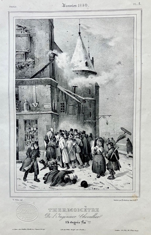 Suite complète de 7 lithographies en noir du peintre et lithographe Victor Adam (1801-1886), et de Sabatier et Bichebois. La planche 7 et dernière n’a pas d’encadrement. La couverture porte une vignette lithographiée d’après Adam intitulée Costumes parisiens. Belle suite lithographiée de scènes de Paris enneigé : Thermomètre de l’ingénieur Chevallier, Château d’eau, Chauffoir public, La Seine au pont de la grève, Champs Élysées, Pont Neuf, Chantier de bois à brûler. Petites rousseurs ; marge supérieure de la couverture brunie. Timbre sec « Bichebois aîné Paris » sur chaque planche.