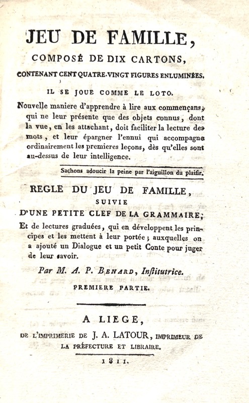 Édition originale illustrée de 10 planches gravées illustrées de 18 motifs chacune en guise de cartons de loto. « Il se nomme le loto. Nouvelle d’apprendre à lire aux commençants, qui ne leur présente que des objets connus dont la vue, en les attachant, doit faciliter la lecture des mots, et leur épargner l’ennui qui accompagne ordinairement les premières leçons, dès qu’elles sont au-dessus de leur intelligence. Règle du jeu de famille, suivie d’une petite clef de la grammaire ; et de lectures graduées, qui en développent les principes et les mettent à leur portée ; auxquelles on a ajouté un dialogue et un petit conte pour juger de leur savoir. » (titre). La deuxième partie commence p. 85, avec pour titre « Petite clef de la grammaire ». 2 cahiers consécutifs marqués K par erreur intervertis (pages 89-96 et 97-104), sans manque. Bel exemplaire tel que paru. . INRP, Les Grammaires françaises 1800-1914. Répertoire chronologique, p. 46 ; Theux de Montjardin, Bibliographie liégeoise (1867), II, p. 386 ; rare. 2 exemplaires au Worldcat (BnF et BM Lyon)