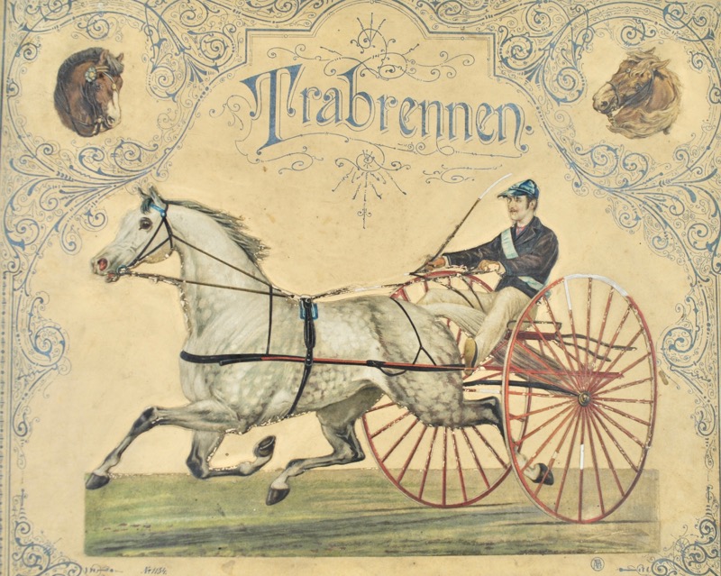 Variante du jeu des petits chevaux sous l’appellation allemande de Trabrennen (course de trot) qui comporte une règle du jeu manuscrite à l’encre du temps, une piste cartonnée dépliante (142 x 30 cm), 4 figurines de trotteurs et leur coursier en fer blancs colorés, 4 soucoupes de 6 cm de diamètre, 3 dés, 64 fausses pièces.