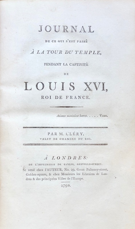 Édition originale de première émission, à l’adresse du n°29 Great Pulteney-Street à Londres. 2 planches hors-texte : la tour du Temple, gravée par Audinet, et plans des deuxième et troisième étages ; 1 fac-similé. Exemplaire complet de la List of Suscribers (16 pp.). Jean-Baptiste Cléry fut pendant 5 mois le valet de chambre de Louis XVI au Temple. « Avant de mourir, Louis XVI lui dit : Plus de courage, Cléry, ceux qui m’aiment ne doivent-ils pas souhaiter la fin d’une si longue agonie ? Cléry lui répond : Ah ! mon maître, si mon zèle a pu vous être agréable, donnez-moi votre bénédiction. Le roi serre alors Jean-Baptiste Cléry contre son sein. Cléry n’est pas libéré car son dévouement au roi lui vaut quelques semaines de détention supplémentaire au Temple. Libéré en mars 1793, il est arrêté et emprisonné à la prison de la Force le 25 septembre 1793. Il n’est libéré que le 9 août 1794, après la chute de Robespierre » (Beauchesne). Tourneux, 3551. Bel exemplaire grand de marges.