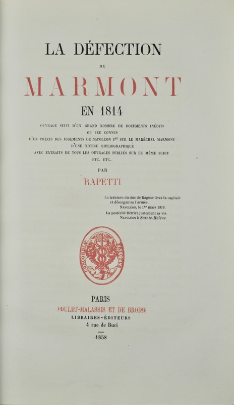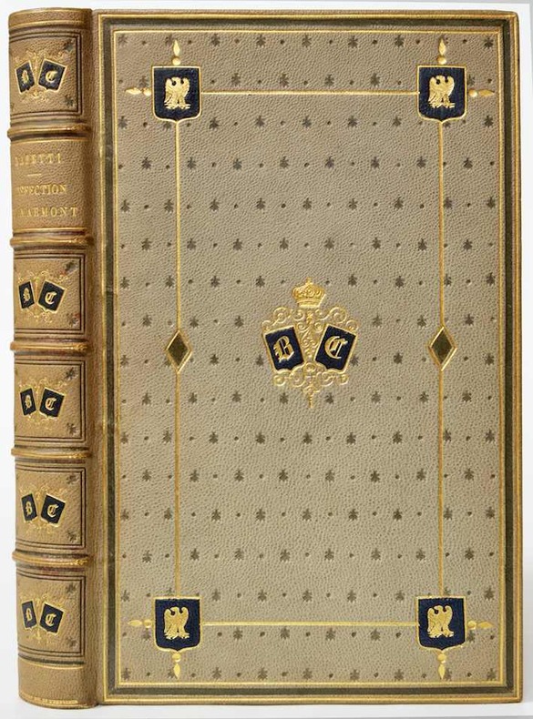 In-8 de (4)-XVII-(3)-475-(1) pp., chagrin olive, gardes et doublures de tabis crème, dos à nerfs orné pour chaque caisson de deux pièces en maroquin noir au chiffre B C, répété avec la couronne impériale au centre des plats , semis d’abeilles et de points, filet doré d’encadrement, pièces d’angles en maroquin noir surmontées de l’aigle impérial, dentelle intérieure, tranches dorées (Despierres relieur de l’Empereur).