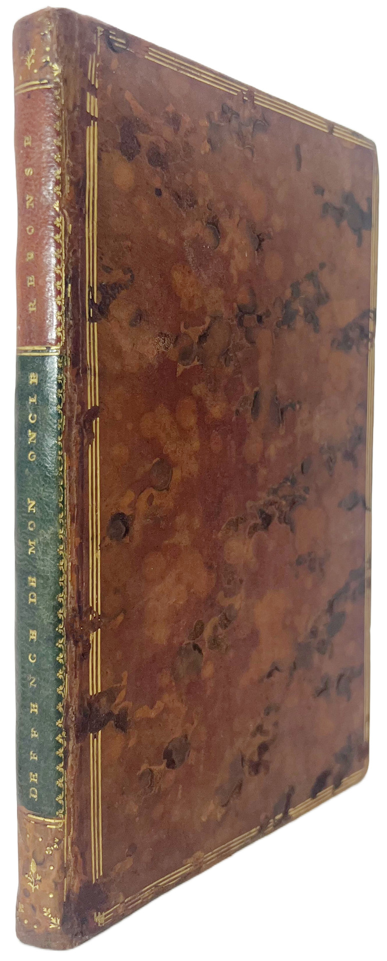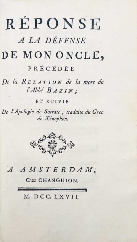 In-8 de 108 pp. [LARCHER (Pierre-Henri)]. Réponse a la Défense de mon oncle, précédée de la Relation de la mort de l’abbé Bazin ; et suivie de l’Apologie de Socrate, traduite du grec de Xénophon. A Amsterdam, chez Changuion, 1767. In-8 de 64 pp. Ensemble 1 vol. in-8, veau marbré, dos plat avec deux pièces de titre, triple filet doré sur les plats, tranches marbrées (reliure de l’époque).