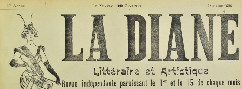 Tête de collection de cette revue littéraire et artistique qui se compose ainsi : 1e année (1896) : 6 numéros bimensuels d’Octobre à Décembre ; 2e année (1897) : 6 numéros mensuels, Janvier-Août-Septembre-Octobre-Novembre-Décembre (le numéro de Décembre 1897 est chiffré 13). 3e année (1898) : 7 numéros de Janvier à Juillet/Août 1898. Le numéro 8 de la 2e année manque. Une quatrième et dernière année fut commencée avec la livraison de Janvier/Février 1899, seule publiée. La revue est bimensuelle jusqu’au mois de Janvier 1897 ; après une interruption de quelques mois, elle devient mensuelle en Août 1897 avant de modifier son titre en Octobre de la même année : La Diane Littéraire, Artistique et Théâtrale. Exemplaire d’Ernest Chebroux : « Hommage de la Rédaction au collaborateur éminent au Maître vénéré Ernest Chebroux Octobre 1898. Edouard Guy, Paulin Ravet, Etienne Seurette, Charles Crespel ». Ernest Chebroux, chansonnier et poète, est né à Lusignan (Poitou) en 1840 (mort en 1910). Sa mémoire est honorée à Lusignan par une rue qui porte son nom. Chansonnier du genre modéré, il avait la vocation mais il dut débuter dans la vie comme apprenti imprimeur. Confiant en sa chance, il monta à Paris où il rencontra des chansonniers, peintres et journalistes. Grâce à des auteurs à succès (Gustave Nadaud), il entra dans le cercle très fermé à la mode « La Lice chansonnière » et ce fut le départ de sa carrière. Il se produisait dans des cabarets chics et chers à la mode, à une époque (IIIème République) marquée par des événements qu’il savait commenter avec humour, sans vulgarité et c’est ainsi qu’il gagna sa célébrité. C’est lui qui fonda l’Oeuvre de la chanson française ayant pour but d’apprendre aux masses populaires et ouvrières les jolies chansons de France. Il a publié en 1885 « Chansons et sonnets » avec préface rimée de Gustave Nadeau. Il fut membre et président de la Lice Chansonnière depuis 1873, du Caveau de Paris depuis 1893, membre d’Honneur du Temple de la chanson de Saint-Etienne. Président d’Honneur du Caveau Lyonnais. Président du Congrès de la Chanson en 1900. Ernest Chebroux collabora à la revue « La Plume » dont il dirigea un numéro spécial consacré à la chanson classique.