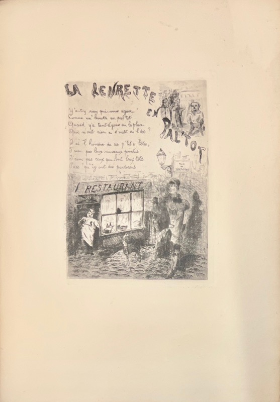Rare publication illustrée dans l’esprit montmartrois. Édition originale et premier tirage des gravures non signées mais attribuées à Cain d’après une note prise sur l’exemplaire de la BNF. Auguste de Chatillon (1808-1881) peintre, ami de Hugo, exposa les portraits de Théophile Gautier, de Victor Hugo tenant son fils François-Victor (Maison de Victor Hugo). Invité à Fourqueux le jour de la première communion de Léopoldine, il fit un tableau représentant cette cérémonie. Il publia un volume de poésies : A la Grand’Pinte, et cette fantaisie illustrée qui le fit connaître. Vicaire III, 311.