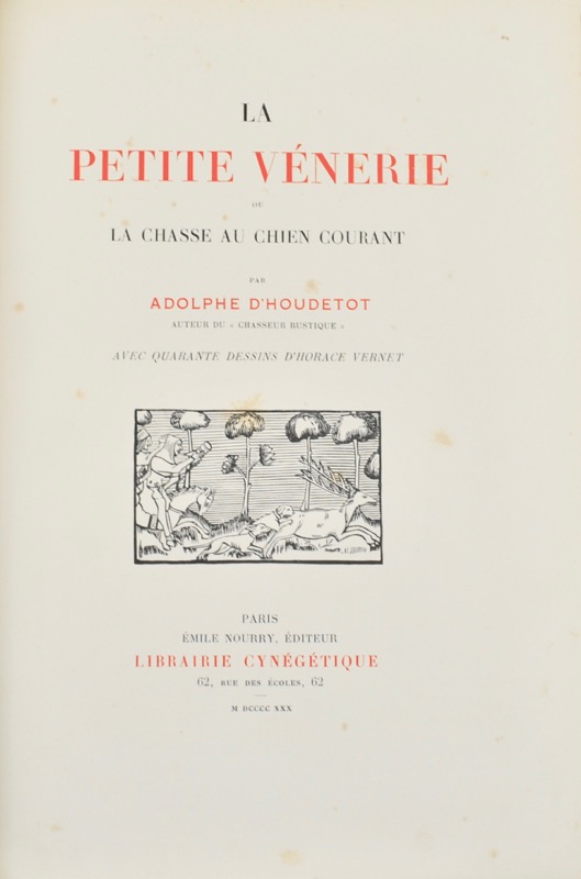 Édition illustrée publiée dans la collection « Les Maîtres de la Vénerie ». L’édition originale a paru en 1855. 10 planches hors texte en deux teintes dont le frontispice et 30 vignettes et culs-de-lampe d’après Victor Adam, et non pas Horace Vernet, comme l’annonce le titre par erreur. Les planches ont été empruntées à l’album sans titre de Victor Adam publié chez Boivin vers 1848 (Thiébaud, col. 4). Tirage limité à 1050 exemplaires ; exemplaire numéroté sur alfa satiné (n°373). Quelques rousseurs. Souhart, 251 (édition originale) ; Thiébaud, 506.