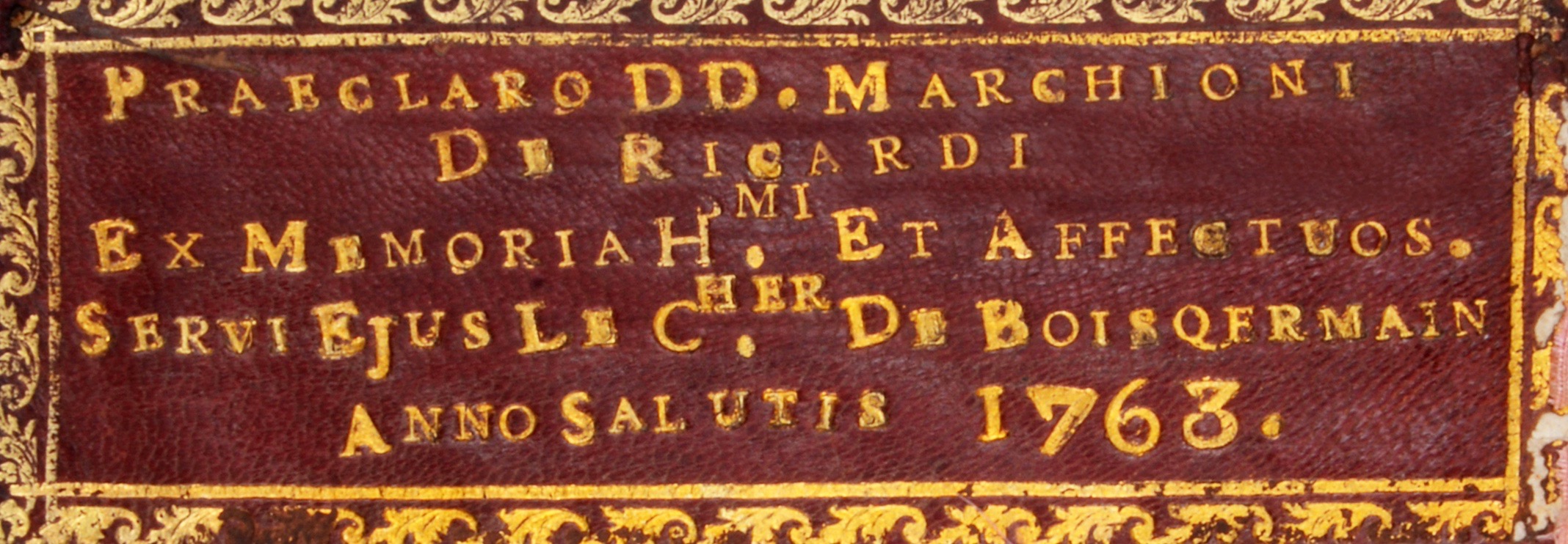 Petit in-8 de 301 pp., maroquin rouge, dos orné à nerfs, filet et frise dorés d’encadrement sur les plats, fleurons aux angles, tranches dorées, contreplats de soie rose (reliure italienne de l’époque).