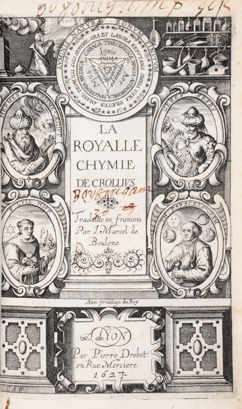 Deuxième édition française conforme à la première établie et publiée par le chirurgien Jean Marcel de Boulenc ou Boulene. Célèbre traité hermético-spagirique en trois parties de l’alchimiste allemand Oswald Croll (vers 1560-1608), disciple de Paracelse et médecin du prince Christian d’Anhalt, publié en latin en 1609 (Basilica) et traduit en français en 1624 : 1. Préface admonitoire, contenant les mysteres tres-profond & plus rares de la Philosophie tant naturelle que de la grace, touchant l’excellence de la medecine Chymique, & grandeur du Microcosme ; 2. La Royalle chymie de Crollius ; 3. Traicté des signatures, ou vraye et vive anatomie du grand & petit monde, troisième et dernière partie (qui manque souvent) précieuse pour la nomenclature figurée des caractères des métaux : l’auteur, faisant entre autres une recherche des noms de plantes qu’il donne en français, latin, grec, italien, espagnol, allemand, flamand et arabe, indique leurs rapports avec différentes parties du corps humain. Les signes des métaux sont aux pages 116-119. Titre-frontispice gravé orné des portraits en médaillon de Hermès Trismégiste, Lulle, Geber, Paracelse. Ex-libris manuscrit à l’encre du temps sur le titre ; note manuscrite ancienne sur le dernier feuillet (réparé) : la science je ne deteste ny meprise ceux la qui la font mes j aborre plus que la poste ceux qui diset plus quil ne font. Exemplaire rogné court en tête, pâles mouillures et petite galerie de ver marginales sur plusieurs feuillets, petite lacération feuillet Oo8. Caillet, I, 2703 ; Dorbon, 946 ; Ferguson, I, 187 ; Duveen, 151.