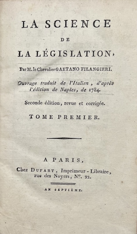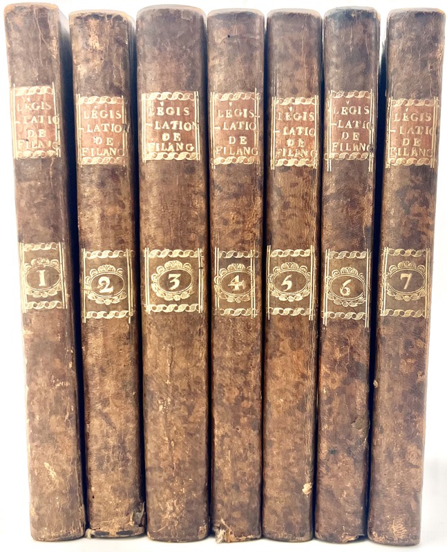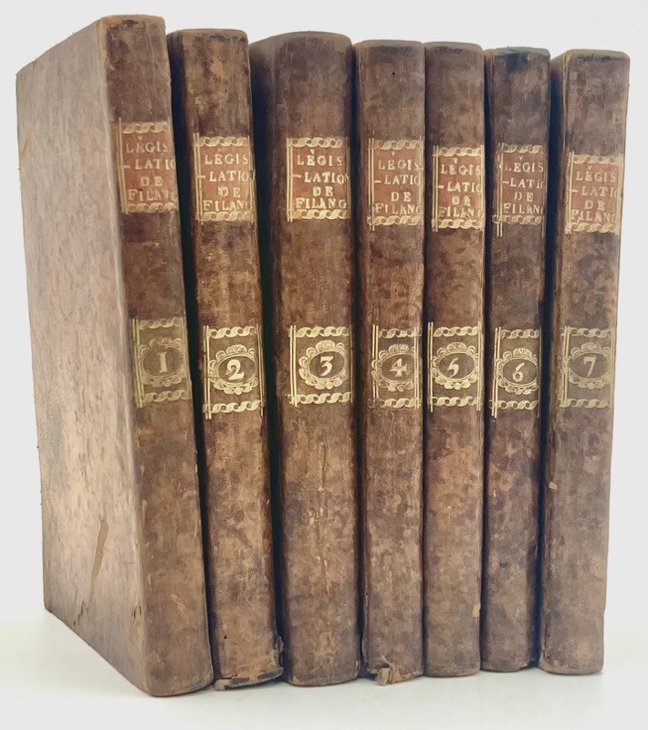Exemplaire composite : seuls les deux premiers volumes appartiennent au second tirage de 1799, les autres au premier.Première traduction française, donnée par Jean-Antoine-Gauvain Gallois. L’originale italienne s’était étagée de 1780 à 1788, avec de nombreuses sorties intermédiaires.Il s’agit d’un ouvrage inachevé en ce que l’auteur, emporté prématurément par la tuberculose en 1788, à l’âge seulement de 36 ans, ne put terminer l’ambitieux dessein de tracer un tableau complet de législation. Tel qu’il nous a été transmis, il demeure cependant un monument des temps nouveaux : inspiré par Vico et Giannone, Filangieri fournit une critique pertinente de l’état juridico-social européen, et, dans une confiance toute méridionale en le despotisme éclairé, demande aux monarques de prendre l’initiative d’une grande réforme législative dont il détaille les applications en économie, éducation, statut du clergé, etc. L’ouvrage est immense et mérita un commentaire attentif de Benjamin Constant.
