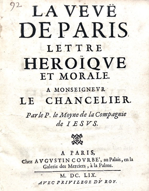 Édition originale. Lettre versifiée consacrée à Paris dédicacée au chancelier de France Pierre Séguier (1655-1661) par le poète jésuite Pierre Le Moyne (1602-1671). Cioranescu, 42384.