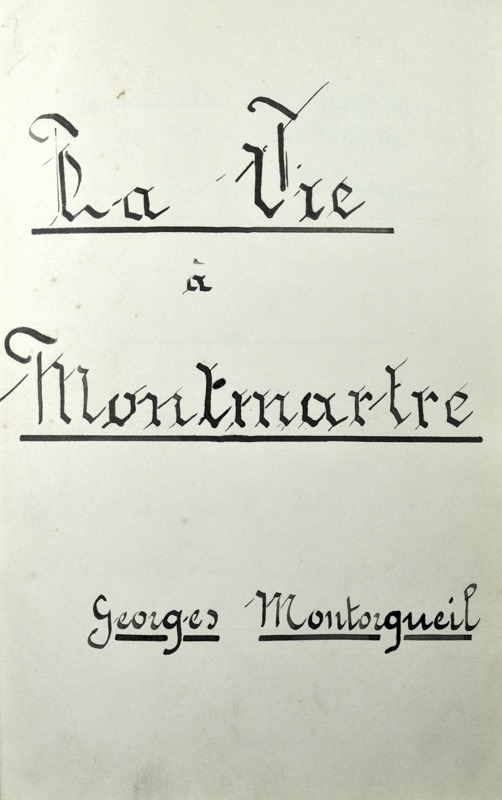 Recueil de pièces imprimées et manuscrites. Ce manuscrit est le 10e chapitre de la Vie à Montmartre; dont le texte imprimé est modifié et raccourci pour les exigences de la mise en page. Georges Montorgueil. 27 janvier 1896. – 4 pp. montées sur onglet du chapitre I [Le Vieux Montmartre] de l’ouvrage paru en 1899, mais d’une composition différente avec 4 illustrations inédites de Vidal dans le texte ; et contrecollé sur un feuillet une partie du prospectus illustrée dans le texte d’une gravure de Pierre Vidal que l’on retrouve dans le Chapitre XIII, la Danse à Montmartre. – 30 pp. sur lesquelles on a contrecollé les feuillets du manuscrit autographe abondamment raturé et corrigé du chapitre complet de Théâtre et Tréteaux. Celui-ci correspond au chapitre onze et non pas dix de l’édition originale. En tête du premier feuillet on trouve : A Mademoiselle Morisot en témoignage de respectueuse estime. G M. A la suite : – un petit croquis sur une lettre à l’entête L’Éclair journal politique quotidien indépendant : […] avez vous rencontré le prince égyptien ! […] – 3 pp. sur lesquelles on a contrecollé des coupures de journaux parues lors du décès de Georges Montorgueuil (1857-1933). – Catalogue de la vente de la Bibliothèque de Georges Montorgueil. Lundi 23 octobre 1933. Paris, A. Besombes, P. Briquet, 1933. In-8 de 43-(1) pp., couverture imprimée conservée. Préface de M. Émile Henriot. Un portrait photographique de Montorgueil en frontispice.