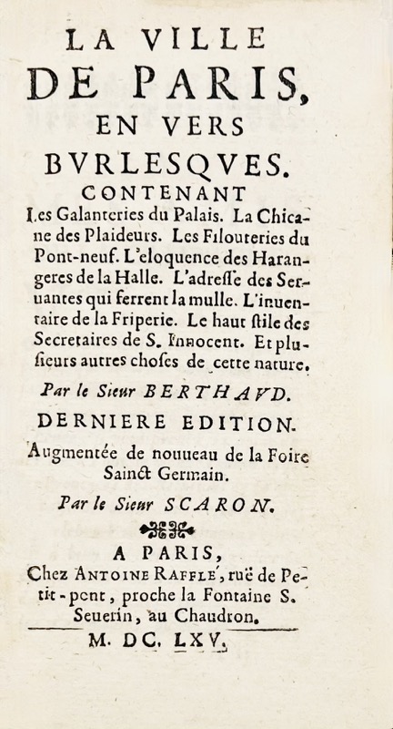 Édition établie sur celle publiée à Paris en 1655. Elle contient de plus La Foire Saint-Germain par Scarron. L’édition originale fut publiée en 1652. Provenance : Henri Bordes, Édouard Moura, tous deux bibliophiles bordelais. Très bel exemplaire. Brunet I, 818 ; Lacombe, Bibliographie Parisienne, 42 ; Catalogue Lacombe, 2678 ; Catalogue des livres de la bibliothèque de feu M. Henri Bordes, de Bordeaux (1911), n°4 ; Catalogue de beaux livres rares et curieux composant la bibliothèque de M. Édouard Moura (1923), n°488.