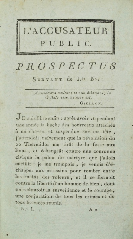 Collection complète. Le numéro 13 n’a pas paru. La dernière livraison (n°35) est brochée. Un des organes les plus remarquables et les plus influents de la réaction contre-révolutionnaire, entièrement rédigé par Richer-Sérisy (1764-1803), ami et collaborateur de Camille Desmoulins pour les divers journaux que celui-ci publia ; Richer-Serisy fut incarcéré quelques mois comme suspect et ce fut après sa libération qu’il se déchaîna contre les hommes et les choses de la Révolution en publiant l’Accusateur public. Il parut à intervalles indéterminés, souvent très distants. Les souscripteurs étaient prévenus dès le numéro un : « Le Rédacteur ne voulant point avilir les nobles fonctions de l’Historien en celles du cocher de diligence, qui pleine ou non, roule sa voiture au jour et à l’heure indiquée, ne s’astreindra pas à un travail périodique et obligé : les seuls Abonnés recevront, dans le cours de l’année, trente-six numéros plus ou moins longs, selon l’importance des matières et la liberté de la presse ». Dénoncé à la tribune et poursuivi comme l’un des auteurs de la journée sanglante du 13 vendémiaire, l’auteur dut suspendre sa publication après le n° 12, mais il la reprit quelques mois après par le n° 14. Les numéros 28, 31, 32 et 34 sont accompagnés de gravures : M. Necker, Le Congrès, Le club de Salm, Massacre des prêtres dans l’Eglise des Carmes. Relié avec, entre les livraisons 15 et 16 : Mémoire à consulter pour Richer Serisy Citoyen français & Rédacteur du Journal intitulé l’Accusateur public, appellant du jugement prononcé contre lui par le Jury spécial qui déclare qu’il y a lieu à accusation pour la conduite qu’il a tenue le 13 Vendémiaire. 8 pp. Très bon exemplaire. Épidermure sur le plat supérieur. La Bédoyère, 1567 ; Walter, p. 35 ; Hatin, 243.