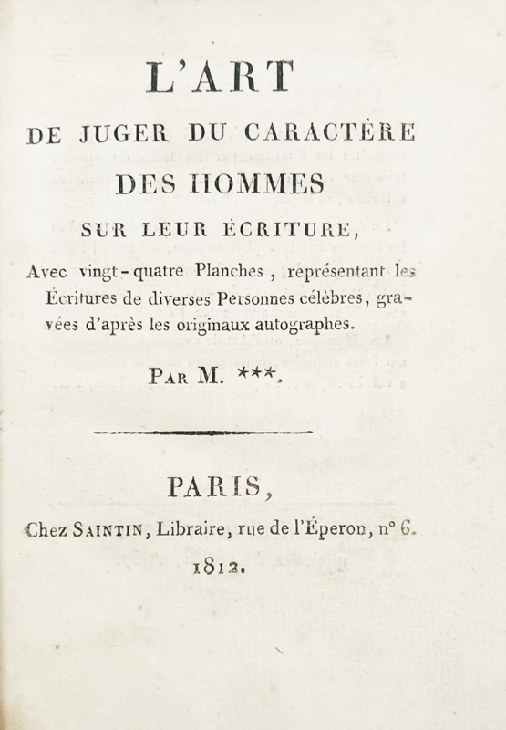 Frontispice en couleur. Deuxième tirage publiée la même année avec renouvellement de la page de titre où la mention « & des femmes » est supprimée, alors que les notices et les planches les concernant sont bien présentes. Manuel populaire de graphologie, écrit par l’imprimeur et libraire Édouard Hocquart (1789-1870). Hocquart utilise la graphologie comme preuve pour étayer ses propres préjugés. Dans son introduction, l’auteur se contente d’observer que l’écriture des Italiens « est remarquable par une délicatesse et une souplesse particulière ; ne sont-ce pas les traits les plus prononcés du génie de la nation ? ». Il aborde également les différences innées entre les mains des hommes et celles des femmes, ces dernières étant prétendument marquées par un manque de force, de délicatesse, etc. Parmi les 43 spécimens, dont beaucoup ne sont attribués à aucun personnage nommé, on trouve des exemples de personnes présentant des traits de caractère tels que le manque d’éducation, la frivolité, le goût de l’ordre et le désir de plaire sans être coquet. On trouve également des exemples tirés de manuscrits de Mazarin, Racine, Frédéric le Grand, Rousseau et B. Franklin. Aucune main n’incarne mieux la grandeur et la noblesse de l’époque de Louis XIV que celle du roi lui-même ; la main de Voltaire, comme pour tout ce qu’il a fait, cela indique une certaine fermeté, mais aussi une légèreté de touche, tandis que celle de d’Alembert est clairement celle d’un mathématicien, et celle de Lavater celle d’un mélancolique flegmatique ; la main d’Élisaberth Iere, protestante, est jugée rigide et ostentatoire, contrairement à l’écriture douce et noble de Marie Stuart, catholique. Ex-libris gravé « Cazenove ».