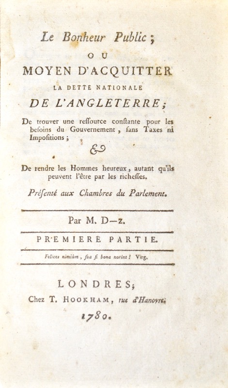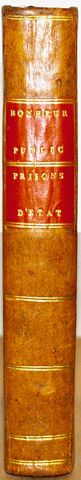 Édition originale. Maître de forges, Desaubiez présente un plan permettant de « rendre les hommes heureux, autant qu’ils peuvent l’être par les richesses ». Ce projet fût présenté au Parlement d’Angleterre. L’éditeur avertit qu’il fut bien édité en Angleterre mais à l’intention du public français. INED, 1353 (les bibliographes de l’INED associent à ce texte un autre ouvrage de Desaubiez sur le commerce des grains, qui ne sera joint que dans les éditions ultérieures). Coquelin-Guillaumin, I, 551. Reliés à la suite : [BEAUPOIL DE SAINT-AULAIRE, comte de]. Histoire d’une détention de trente-neuf ans, dans les prisons d’État, écrite par le Prisonnier lui-même. Amsterdam, 1787, [5]-138 pp. Édition originale de cet ouvrage célèbre. Le titre de départ porte : « Mémoires du sieur Henri Masers de Latude, contenant les opérations qu’il a pratiquées pour se sauver de la Bastille, & deux fois du Donjon de Vincennes, avec la suite de ces événements ». Un Latude crédible y parle à la première personne. Malheureusement l’ouvrage est du à Beaupoil de Saint-Aulaire et Latude la désavoua. Cachet sur la page de titre. Qqs rousseurs. Description abrégée de l’Hôpital royal de la marine à Greenwich, extraite de la Relation historique, publiée par Messieurs les Chapelains, et traduite par Madame W. Charron. S.l., Cette description ne se vend qu’à l’Hôpital, s.d., 40 pp. Bel exemplaire. Plats légèrement frottés. Cachets. Rousseurs anecdotiques.