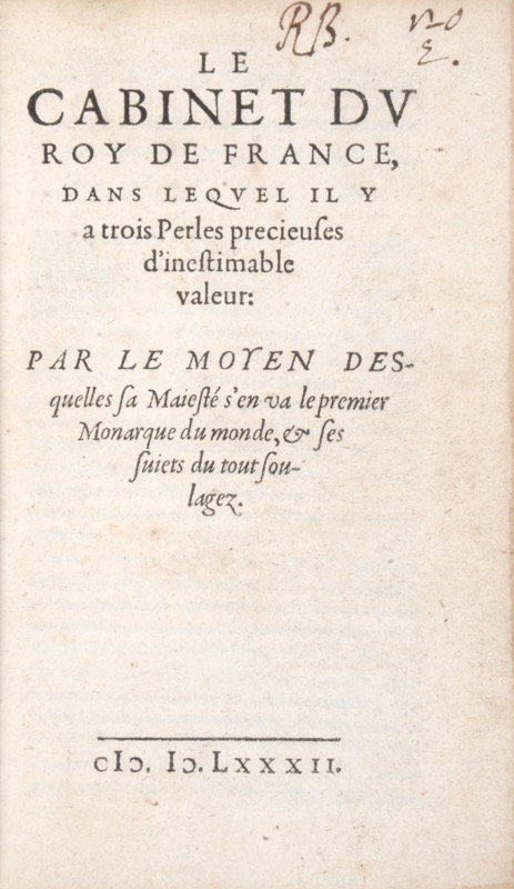 Deuxième édition d’un des premiers ouvrages français d’économie politique. La composition est identique à la première édition et est datée (à la fin de la dédicace) du premier novembre 1581. La première édition (1581) porte également à la fin de la dédicace la date du premier novembre 1581. La ressemblance du style, du préambule et de l’épître dédicatoire, datée de novembre 1581, l’ont fait attribuer à l’auteur des Secrets des finances de France publiés sous le pseudonyme de Froumenteau qui serait celui de Nicolas Barnaud. Les trois perles précieuses invoquées sont la parole de Dieu, la noblesse et le tiers état. Ecrit en pleine Ligue, l’ouvrage contient plusieurs longs poèmes violents sur les Indignitez de la Cour, les Blasons de la Cour, etc. L’auteur fait le compte des dix millions de personnes qui font profession de l’impiété & Polygamie en l’Eglise Gallicane, parmi lesquelles les quatre cent mille Putains Cardinales, Episcopales, abbatiales, les vingt autres mille Putains des Chartreux et les cinq cent mille Maquëreaux et Maquerelles. Bel exemplaire dans une reliure de Derome, avec le code prix du libraire Guillaume-Luc Bailly (Erick Aguirre, Le libraire Guillaume-Luc Bailly et l’atelier Derome le Jeune, Bulletin du bibliophile (2018), 129-172). INED, 226 ; Haag I, 251 ; Hauser III, 2342.