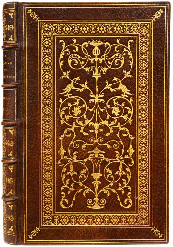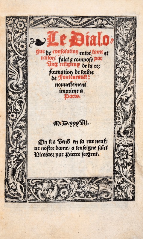 Belle impression en bâtardes gothiques à l’adresse de Pierre Sergent partagée la même année avec Denys Janot et les Angeliers. Titre rouge et noir dans un encadrement fait de quatre bordures, au verso duquel se trouve un bois sur fond criblé et à, pleine page (Te Deum). Imprimé une première fois en 1499, « le Dialogue de consolation entre l’âme et raison du moine natif d’Évreux François Le Roy, religieux de l’ordre de Fontevrault est l’exemple d’un dialogue intérieur à la manière des Soliloquia et d’inspiration strictement religieuse : les maux à consoler sont ici les souffrances spirituelles et les affres de la tentation » (Alexandre Tarrête, Remarques sur le genre du dialogue de consolation à la Renaissance). Bel exemplaire luxueusement relié au XIXe siècle, orné de la plaque dorée dite au Pot cassé conçue et gravée au XVIe siècle à sa marque par l’imprimeur Geoffroy Tory. Brunet, II, 669 ; Bechtel, Catalogue des gothiques français, L-217.