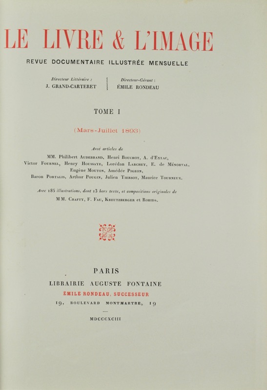 Collection complète rare de cette superbe revue pour bibliophiles abondamment illustrée. Directeur littéraire : John Grand-Carteret. Directeur-gérant : Émile Rondeau. Collaborateurs : Bouchot, Tourneux, Fournel, Portalis, Tiersot, Larchey. Tome I (mars-juillet 1893), 185 illustrations dont 13 hors-texte et compositions originales de Crafty, Fau, Kreutzberger et Robida. Tome II (août-décembre 1893), 245 illustrations dont 23 hors-texte et nombreuses compositions originales de Henriot, Adeline, Fau, Grenier, Giranne, Piguet, Pille, Régamey, Villette. Tome III (janvier-juin 1894), articles sur l’iconographie, le livre, la bibliophilie, les collectionneurs. Provenance : Edgar Servant (1847-1917), lieutenant, puis capitaine aux Tirailleurs algériens, médecin et bibliophile avec ex-libris au zouave dessiné et gravé par Pen Kerch, relié en tête du tome I sur papier rose. Très bel exemplaire dans une reliure signée Charles Meunier.
