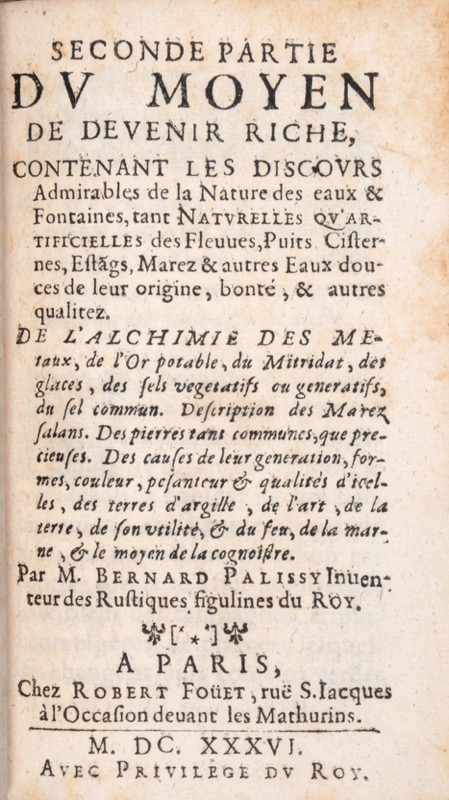 Première édition collective et posthume des oeuvres palisséennes en deux parties : Maniere veritable (publié en 1563 sous le titre “Recepte véritable ») et Discours admirables (1580) réunis en 1636 sous le titre attrayant Le Moyen de devenir riche par le libraire parisien Robert Foüet alors que Bernard Palissy était tombé dans l’oubli. Bernard Palissy (v. 1510-1589), céramiste renommé à la cour de Catherine de Médicis et inventeur des « rustiques figulines », se distingue également comme philosophe, écrivain et pionnier de la géologie. Protestants convaincu, il fut ministre à Saintes avant de devenir émailleur du Roi à Paris, où il enseigna l’histoire naturelle. Ses convictions religieuses lui valurent d’être arrêté à près de 80 ans ; il échappa au bûcher mais mourut emprisonné à la Bastille. Ses écrits reflètent son esprit novateur. La Recepte véritable, composée de quatre traités, propose des réflexions sur la gestion des ressources, la philosophie naturelle, la conception de jardins et l’architecture militaire. Dans ses Discours admirables de la nature des eaux et fontaines, il rejette les doctrines alchimiques, critique l’or potable de Paracelse, et explique les phénomènes des eaux minérales et de cristallisation, posant ainsi les bases d’une cristallographie scientifique. Visionnaire, Palissy incarne l’alliance entre art, science et foi à une époque de bouleversements religieux et intellectuels. Provenance : bibliothèque de Louis-Léon-Félicité de Brancas de Lauraguais (1733-1824) avec son ex-libris armorié aux initiales BCDL gravées dans les angles, sur le premier contreplat (ne figure pas au Catalogue d’une collection de livres choisis, provenans du cabinet de M *** (Paris Guillaume De Bure, fils aîné, 1770). Plus connu sous le nom de comte de Lauraguais, il compte parmi les grands bibliophiles du XVIIIe siècle. Membre de l’Académie des Sciences, il fit construire atelier et four à céramique dans son hôtel de Lassay et fut le premier en France, avec l’aide de Darcet, à expérimenter la fabrication de la porcelaine dure (faite avec du kaolin) dont le Japon et la Saxe avaient jusqu’alors gardé jalousement le secret et que Sèvres développera avec succès quelques années plus tard. Il dut se défaire de sa bibliothèque en 1770 pour faire face à une situation financière dramatique (Olivier-Hermal-Roton, 740). Cachet “Amblard avocat” sur le titre. Très bon exemplaire. Traces de frottement, habile restauration dans la marge intérieure du titre, sans perte de lettres, faite au moment de la reliure au XVIIIe siècle ; petites taches, rousseurs, renforts sans gravité. Petite fente au bas de la charnière du premier plat. Brunet, IV, 319 ; Dorbon, n°3450 ; inconnu à Caillet (édition 1777) ; Duveen, p. 446 ; Debure, n°1503 « ouvrage singulier et recherché, dont les exemplaires se trouvent peu communément » ; voir : Juliette Ferdinand, Bernard Palissy Artisan des réformes entre art, science et foi, 2019.