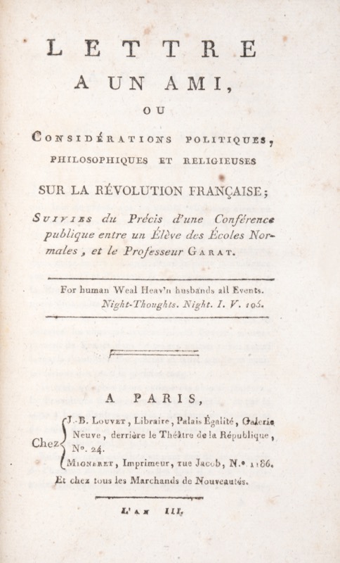 In-8 de (4)-232 pp. Lettre à un Ami, ou Considérations politiques, philosophiques et religieuses sur la Révolution française. Suivies du Précis d’une conférence publique entre un Élève des Écoles Normales et le Professeur Garat. A Paris, chez Louvet, Migneret, an III [1794-1795]. In-8 de (4)-83 pp. Ensemble 1 vol. in-8, chagrin bleu, dos orné à nerfs, encadrement à froid et doré sur les plats, chiffre couronné au centre du premier plat, dentelle intérieure, guillochis dorés sur les coupes, tranches dorées (relié vers 1830).