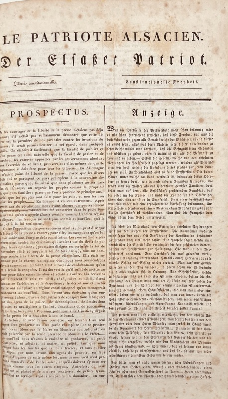 Collection très rare avec son prospectus, de la première livraison publiée le dimanche 16 janvier 1820 au n°35 et dernier daté mercredi 5 avril 1820, suivie de la feuille imprimée le 6 avril 1820 Le Patriote alsacien et le Courrier du Bas-Rhin. Trihebdomadaire alsacien bilingue français et allemand, témoin des soubresauts de la liberté de la presse au tournant de 1820, fondé après la loi de Serre et suspendu après le retour des Ultras. Directeur et rédacteur : C. Marchand « jusqu’à présent attaché à la rédaction du Censeur européen ». « Plusieurs autres départements jouissent des bienfaits de la liberté de la presse. Pourquoi ne suivrait-on pas cet exemple en Alsace (…) La feuille que je rédigerai offrira principalement au lecteur des nouvelles étrangères, des nouvelles de Paris et des nouvelles du département du Bas-Rhin (…) soit en matières d’impôts, soit en matière de commerce et d’agriculture (…) Le Patriote Alsacien aura des relations sûres avec l’Allemagne (…) Strasbourg l’une de nos premières places fortes offrira souvent au rédacteur du Patriote alsacien l’occasion d’entretenir ses lecteurs des devoirs du citoyen et de ceux du soldat (…) il sera heureux de pouvoir rendre hommage à l’excellent esprit qui anima toujours les habitants de cette cité et au dévouement dont nos braves sont prêts à donner l’exemple pour conserver les institutions, sans lesquelles il n’est de sécurité pour personne, et avec lesquelles on assure les prospérités de tous. Le Patriote alsacien sera imprimé en français et en allemand dans un format beaucoup plus grand que celui des feuilles déjà publiées à Strasbourg (…) Strasbourg le 5 janvier 1820 » (Prospectus). L’édition spéciale du 6 avril 1820 reliée en fin d’exemplaire (1 feuillet) opposa C. Marchand à Engelhard du « Courrier du Bas-RhIn » dont le journal continua à paraître malgré les restrictions. Tous les numéros portent le Timbre Royal et le Timbre à l’extraordinaire du Bas-Rhin. La 4e livraison manque. Discrètes restaurations, rousseurs, pâles mouillures.