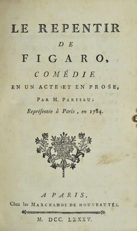 Édition originale. Parodie de La Folle Journée représentée le 28 juin 1784 à l’Ambigu-Comique. « Dramaturge qui excellait dans la parodie, Pierre-Germain Parisau (1752-1794) avait été clerc de procureur, agent d’affaires puis acteur et directeur d’un théâtre appelé les élèves de l’Opéra, boulevard du Temple. Il fonda un journal satirique contre la Révolution, La Feuille du jour. Sa maison fut pillée le soir du 10 août 1792. Arrêté, il mourut sur l’échafaud en 1794 » (Grente). Cordier, 223 pour un tirage postérieur (1785).