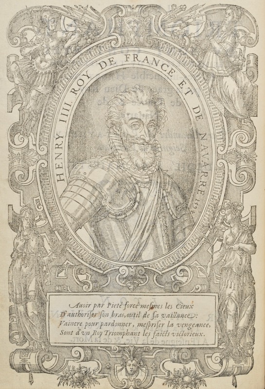 1. Édition originale de ce poème composé par un gentilhomme dauphinois protestant. Panégyrique dédié à Henri IV, offrant un bilan versifié de la politique française au moment de l’entrée du souverain dans Paris. L’auteur souligne en particulier la misérable condition de la France, qui est ce iourd’huy l’unique eschaffaut de Mars, où toute la rage du monde s’est transportée. Superbe portrait gravé sur bois du roi Henri IV, en médaillon dans un encadrement Renaissance, imprimé au verso du titre. 2. Pièce de politique contemporaine anonyme, également en vers et ornée du même portrait, dédiée au roi par un sonnet et une longue épitre. Exemplaire parfait, en reliure de Capé. Provenance : William Martin (1869, n°515), Paul Grandsire (1930, n°111), général Jacques Willems, Jean-Paul Barbier. Exemplaire cité par Brunet (Suppl. II, 278) ; P. Berès, Des Valois à Henri IV, n°279 ; Brunet IV, 809 ; Haag VIII, 295 ; N. Ducimetière, Mignonne, allons voir… n°130.