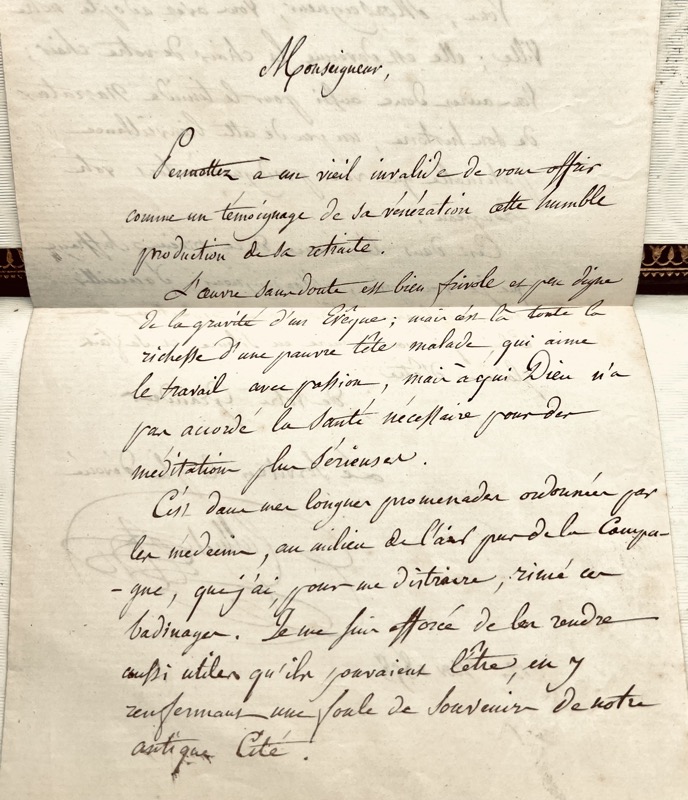 Édition originale. Promenade historique et versifiée dans Chartres par l’abbé Jean-Nicolas-Augustin Calluet, chanoine honoraire, ancien principal du collège de Chartres, conservateur du musée de cette ville, né à Chartres le 5 mai 1791, mort à Chartres le 16 mai 1863. Lettre autographe signée jointe. Très bel exemplaire.