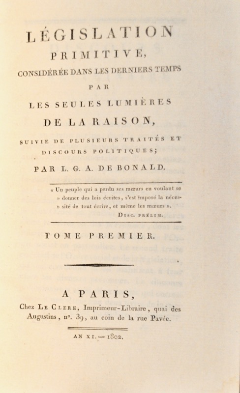 Édition originale de la Législation primitive. Traité majeur du vicomte de Bonald qui développe les idées de son premier ouvrage, Théorie du pouvoir politique et religieux dans la société civile, publié en exil à Constance, où il se posait en défenseur du catholicisme et des principes monarchiques. Petit accident à une coiffe. Bon exemplaire.