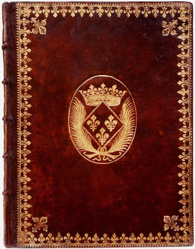 In-4 de 56 pp., maroquin rouge fleurdelisé, dos orné à nerfs, frise et roulette dorées d’encadrement sur les plats, armes sur les plats, fleur de lys en écoinçons, tranches dorées (reliure de l’époque).
