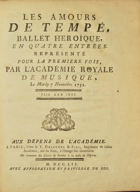 Édition originale. Livret de l’opéra-ballet en quatre actes avec prologue, attribué à Louis de Cahusac sur une musique de Dauvergne, représenté à l’Opéra le 7 novembre 1752. Les quatre entrées sont précédées de leur titre propre : Le Bal, ou l’Amour discret – La Feste de l’himen, ou l’Amour timide – L’Enchantement favorable, ou l’Amour généreux – Les Vendanges, ou l’Amour enjoué. Exemplaire aux armes royales d’Adélaïde de France (1732-1800), quatrième fille et sixième enfant de Louis XV et de Marie Leczinska, cité par Olivier-Hermal-Roton. Elle fut appelée successivement Madame Troisième, Madame Adélaïde, Madame (1755) et Madame Adélaïde (1774). Après la mort de Louis XV, elle résida au château de Bellevue. A la Révolution, elle quitta la France avec sa soeur, Madame Victoire. Elles se rendirent à Rome, chez le cardinal de Bernis, puis à Naples auprès de Ferdinand IV. Elle mourut à Trieste le 27 février 1800. Les volumes ayant appartenu à Mesdames de France, filles de Louis XV et de Marie Leczinska, ne se distinguent que par la couleur du maroquin sur lequel sont frappées leurs armes : maroquin rouge pour Madame Adélaïde, maroquin vert pour Madame Victoire, et maroquin citron pour Madame Sophie. Leurs livres sortaient des mains des mêmes relieurs : Fournier qui tenait boutique à Versailles dans le vestibule du château et suivait la cour dans ses déplacements et Vente à la fois libraire et relieur. Des trois princesses, Madame Adélaïde est la seule qui ait marqué sa place parmi les véritables bibliophiles ; sa bibliothèque était d’ailleurs bien plus considérable que celle de ses soeurs et compta 10000 volumes quand elle fut vendue aux enchères lors de la Révolution. Bel exemplaire. Les quatre feuillets du cahier A liminaire ont été reliés dans le désordre (successivement A2, A1, A4, A3). Provenance : Léon Rattier (ex-libris) ; Vente Freund-Deschamps (1923), n°2 . Olivier-Hermal-Roton, planche 2514, fer n°1 (cet exemplaire) ; cachet couronné non identifié ; exemplaire non décrit par Quentin-Bauchart, Les Femmes Bibliophiles de France, pp. 123-155 ; Guigard, I, 103.