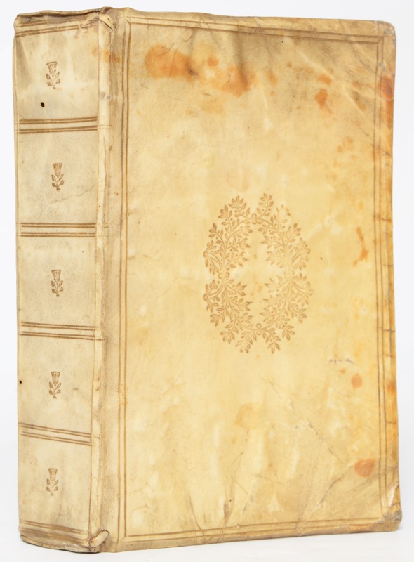 2 parties en 1 vol. in-8 de (16)-212 ff. et (4)-121 ff. (mal chiffrés 119), (3) ff., vélin doré souple, médaillon de feuillages et encadrement de deux filets dorés sur les plats, dos lisse orné de motifs dorés, tranches dorées (reliure de l’époque).