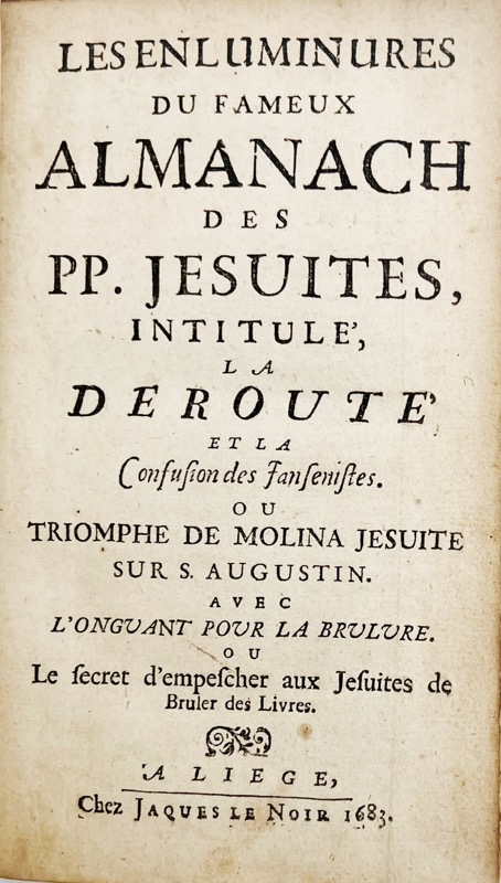 ![[LE MAISTRE DE SACY (Isaac-Louis)]. Les Enluminures du fameux almanach des PP. Jésuites, intitulé, la Déroute et la confusion des Jansénistes ou Triomphe de Molina, jésuite, sur S. Augustin. BARBIER D'AUCOUR (Jean). Onguant ["sic"] pour la brûlure, ou le Secret d'empescher les jésuites de brûler les livres.](https://bonnefoi-livres-anciens.com/wp-content/uploads/2026/02/44662_1.jpg)