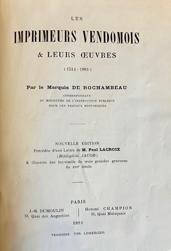Deuxième édition augmentée d’une lettre de Paul Lacroix le bibliophile Jacob, adressée à l’auteur. 3 fac similés hors texte de « grandes gravures du XVIe siècle ». Envoi autographe signé : A Monsieur le Mis de Beaucourt hommage de l’auteur. A. de Rochambeau. Dos fendu.