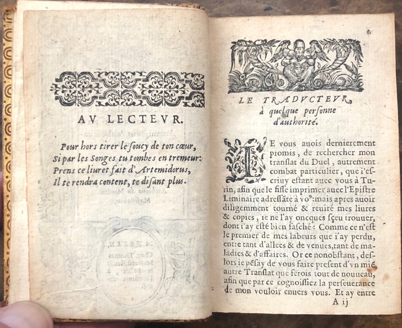 Rare édition rouennaise sortie des presses de Thomas Mallard ornée d’un titre gravé à encadrement. Le seul traité antique d’onirocritique parvenu intègre à l’âge moderne, très populaire voire influent au Moyen-Âge jusqu’à Freud qui reconnut là « l’exposé le plus complet et les plus consciencieux sur l’interprétation des songes dans le monde gréco-romain » (L’Interprétation des rêves). Les trois premiers livres traduits du grec en français furent publiés en 1546, complétés par les deux derniers pour la première fois en 1555 ; le livre d’Augustin Niphe sur les divinations et augures et le traité de Maxime Valère sur les songes furent imprimés à la suite en 1576 pour établir une édition définitive sur le sujet qui sera reprise à l’identique au XVIIe siècle. Reliure partiellement épidermée, dont le caisson de tête noirci sur le dos, mors supérieur fendu. Brunet, I, 517 ; Caillet, I, 468.