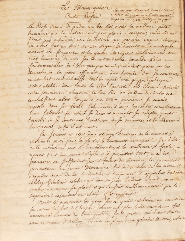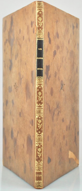 Copie manuscrite établie vers 1776. Une note jointe au titre de départ : « elle est actuellement dans le livre intitulé les Entretiens de l’autre monde imprimé en 1784, dialogue VI page 150 ». Pamphlet attribué en 1776 au Comte de Provence (futur Louis XVIII), hostile à Turgot et aux Économistes, qui circula en manuscrit l’année du renvoi du ministre réformateur sous la pression de la Cour et des privilégiés (le 22 mai 1776) ; le texte fut publié par Mettra dans les livraisons des 8 et 15 juin de la Correspondance littéraire secrète de la même année, avant de paraître séparément l’année suivante toujours sous le voile de l’anonyme : Les Mannequins, conte ou histoire comme l’on voudra. A Ispahan (1777). « L’auteur suppose que tout est mannequin dans le monde, c’est-à-dire, suit involontairement, une impulsion étrangère. Le Roi, suivant lui, est le premier des mannequins, et il le peint comme propre à se laisser conduire, tant à raison de sa jeunesse, que de la flexibilité et du peu de consistance de son caractère. (…) Pour rendre son ouvrage plus intéressant, l’écrivain transforme le système économique en un monstre, qu’il anime et qu’il représente avec tous les attributs qui peuvent le rendre odieux ou ridicules (Mémoires secrets, IX, 1777, pp. 175-176). En 1801, dans ses Mémoires historiques et politiques du règne de Louis XVI, Soulavie en donnera une version remaniée intitulée Le Songe de Maurepas ou les Machines du Gouvernement français. Suivi de la clef donnant la liste des dix-huit personnages où l’on découvre que la “Perse” est la France, “Ispahan” Paris, “le Sophy” Louis XVI, “Alibeg” Maurepas etc. Provenance : comte René Philipon (1870-1936) du château de Vertcoeur à Milon-la-Chapelle avec son ex-libris à la licorne signé J. de Andrada 1917 ; second ex-libris non identifié “J. de C.” aux deux colombes rappelant le motif poussé sur la reliure, daté au crayon 1938. Barbier, III, 33.