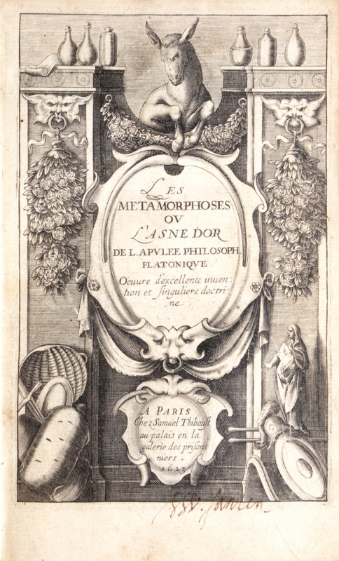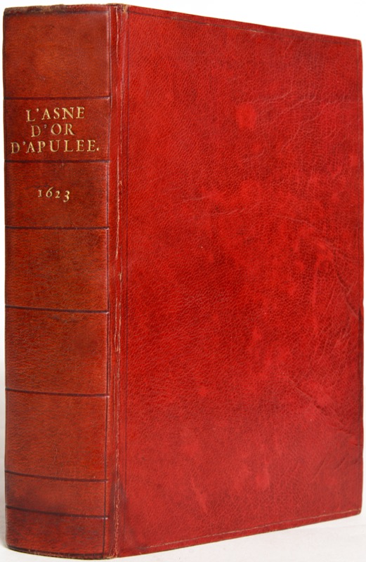 2 tomes en 1 vol. in-8 de (20) ff. (frontispice, épître dédicatoire à Jean de Rouen seigneur de Heunières, vie de l’Apulée, préface, privilège), 525 pp. (plusieurs erreurs de foliotation, quelques feuillets déplacés) et 352 p. (Commentaire), maroquin rouge, dos lisse, titre et date dorés, filet d’encadrement à froid aux plats, roulette intérieure, tranches dorées (reliure du XVIIIe siècle).