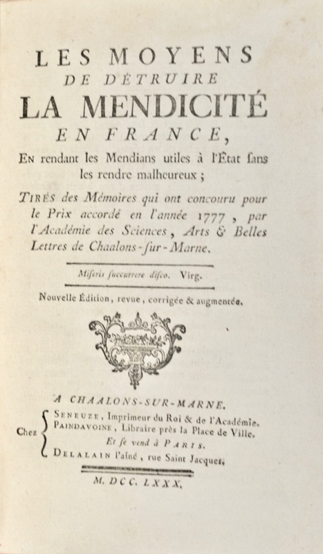 Deuxième édition augmentée. La première édition (publiée en 1779) porte ce titre : Résumé des Mémoires qui ont concouru pour le Prix accordé en l’année 1777, par l’Académie des Sciences, Arts & Belles Lettres de Chaalons-sur-Marne. et dont le sujet étoit, Les Moyens de détruire la Mendicité en France, en rendant les Mendians utiles à l’État, sans les rendre malheureux. INED, 3039 : « Moyens propres à supprimer les mendicité. S’attacher à détruire la mendicité illégitime. Ce n’est pas par les hôpitaux, jugés néfastes, mais par le travail, qu’on aide les mendiants, qu’ils soient valides ou invalides. M. admet néanmoins l’existence de bonnes œuvres, de Monts-de-Piété, de loteries, etc. Enfin, il propose de supprimer ce qu’il estime être les sources de la mendicité, telles l’usure, la prostitution, etc. ». « Excellent livre, bien supérieur encore à tous les essais tentés de nos jours. Le style en est peu déclamatoire ; mais l’ouvrage est rempli de vues ingénieuses et de faits spécieux » (Coquelin & Guillaumin). Bel exemplaire.