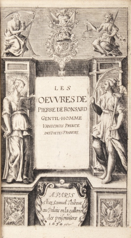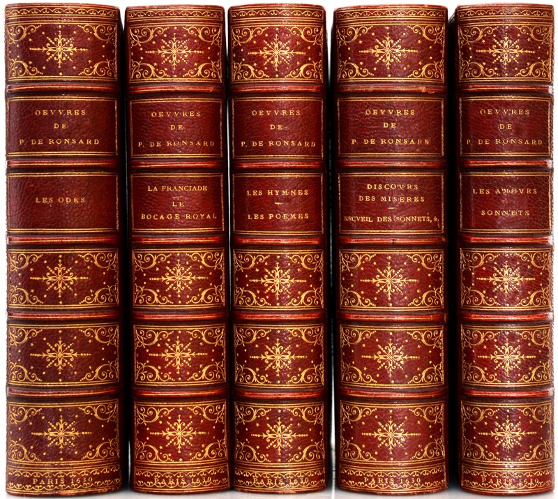 Quinzième et dernière collective ancienne, partagée entre les libraires Mathurin Hénault pour le tome I daté 1629, Samuel Thibout et Rolin Baraigne pour les tomes II à XI datés 1630, ornée de 5 frontispices à encadrement non signés (différents de celui gravé par Léonard Gaultier pour les collectives précédentes) : « Les Oeuvres » (tome I), « Les Odes. Tome II », « Les Quatre premiers Livres de la Franciade. Tome III » , « Le Hymnes. Tome VII », « Discours des Misères de ce temps. Tome IX ». La composition des tomes est la même que dans l’édition de 1617, distribués de la manière suivante : [vol. 1]. Tome I. Les Amours [vol. 2] II. Les Odes [vol. 3] III. Les Quatre premiers livres de la Franciade IV. Le Bocage royal V. Les Eglogues et mascarades VI. Les Elegies. [vol. 4] VII. Les Hymnes VIII. Les Poèmes [vol. 5]. IX. Discours des misères de ce temps. X. Les Épitaphes de divers sujets. Les derniers vers, le discours de la vie de Ronsard par Claude Binet, L’Oraison funèbre et le Tombeau de Ronsard XI. Recueil des sonnets, odes, hymnes, élégies et autres pièces retranchées aux éditions précédentes. Vignette gravée sur bois au titre général répétée au verso des titres des tomes II, III, IV, VIII et IX montrant le buste de Ronsard couronné par Virgile et Homère ; portrait sur bois répété du souverain Henri III aux tomes I, III et IV. Provenance : Henri Monod, avec son ex-libris portant la devise « libro liber » et ses initiales dorées sur le premier plat (catalogue, 1920, n° 299) ; Édouard Moura (ex-libris, catalogue privé, 1921, n° 209) ; Henri Lambert (ex-libris, catalogue, Paris, Durel, 1884), bibliothèque de l’hôtel de Jarnac à Paris. Bel exemplaire relié par Allô truffé d’un portrait sur cuivre de Ronsard relié en tête (tome I), profil à gauche, tête laurée, toge à la romaine, gravé en 1778 par C.S. Gaucher d’après Cl. Mellan pour le tome V des Annales Poétiques. Brunet, IV, 1375 ; Tchemerzine V, 492 ; Barbier-Mueller, II, n°38.