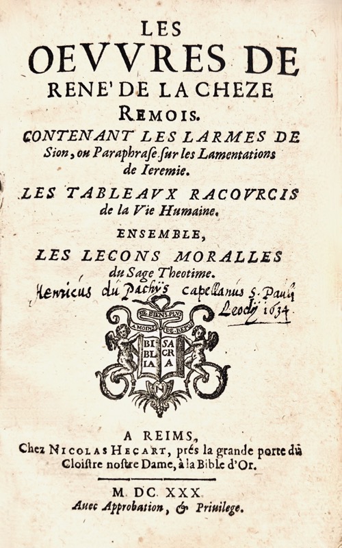 Édition originale. Elle comprend trois parties, chacune avec son titre particulier : Les Larmes de Sion, ou Paraphrase sur les lamentations de Jérémie ; Les Tableaux racourcis de la vie humaine ; Les Leçons moralles du sage Théotime. « René de La Chèze est complètement inconnu de tous les biographes, même de Colletet, qui dans son discours de la poésie morale ne le cite point parmi les nombreux poètes tétrastiches (poésie composée de quatre vers ndlr) sentencieux et moraux français qu’il a catalogués. Je puis expliquer cet oubli que par l’extrême rareté de ces traités, car le talent de La Chèze méritait au moins une mention. (…) Il me semble qu’il y a dans ces quatrains quelque chose d’original et de pittoresque qui leur donne un caractère particulier. C’est celui de l’auteur dans tous ces petits traités, d’ailleurs fort bien imprimés » (Viollet le Duc). René de La Chèze, doyen du chapitre de Sillé en Champagne, est l’auteur de deux poèmes dans le Recueil sur les conquestes du roy en Hollande (1673) et d’une plaquette sur le même sujet Le siège de Maestrik (1674). Ex-libris manuscrit au titre « Henricus du Pachÿs capellanus S. Pauli Leodii 1634 » (Henri du Pachis chapelain de Saint-Paul de Liège). Ex-libris armorié XIXe « Rordkirchen ». Pâles rousseurs. Brunet, III, 728 ; Viollet le Duc, Bibliothèque poétique, 1843, p. 422 ; Arbour, n°14000 ; Lachèvre III, p. 368.