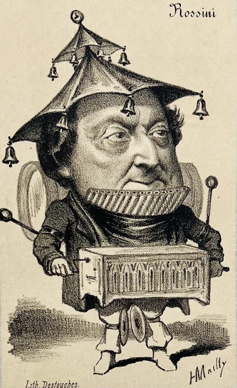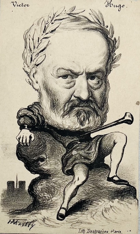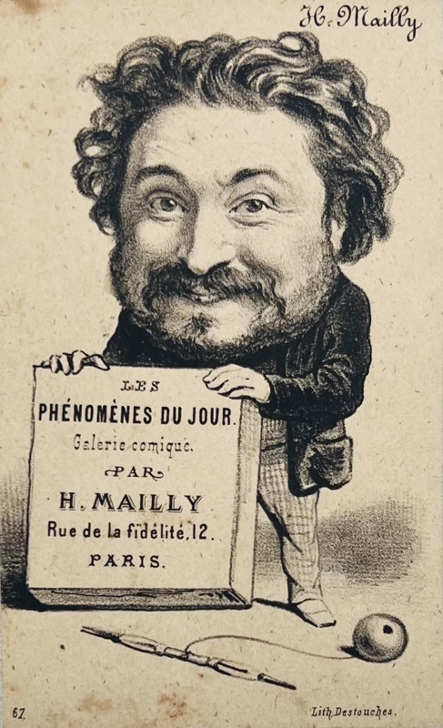 Très rare suite de charges caricaturales croquant les personnalités du moment : Victor Hugo, Théophile Gautier, Alexandre Dumas, Champfleury, Monselet, Rossini, Auber, Déjazet, Offenbach, Daumier, Gill, etc. Hippolyte Mailly, né à Villers-Coteret en 1829 (mort le 16 septembre 1888 à Bazancourt), dessinateur lithographe, avait collaboré à plusieurs journaux du second Empire, dont le Bouffon et le Hanneton. Mailly qui s’était fait connaître par ses charges-métamorphoses, avait publié en 1868 une série de portraits sous le titre de Recueil de 36 binettes contemporaines, puis cette très rare série publiée avant la chute de l’Empire. Après les événements de 1871, il parcourut la province, faisant des photographies et des portraits-charges, puis se fixa à Reims et publia des caricatures dans un journal de cette ville. Bel exemplaire.