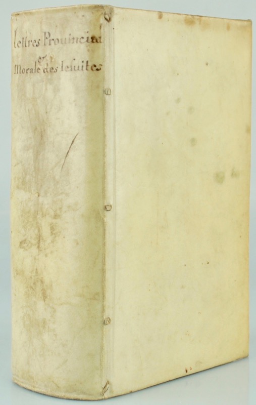 In-8 de (16)-355-(1) pp. Suivi de : Censura sacrae Facultatis theologiae parisiensis in librum cui titulus est Amadaei Guimenii (…) Paris, Vitré, 1666. 20 pp. La Théologie morale des Jésuites et Nouveaux Casuistes : représentée par leurs pratiques et par leurs livres : condamnée il y a déjà longtemps par plusieurs censures, décrets d’université et arrêts de cours souveraines : Nouvellement combattue par les curés de France ; et censurée par un grand nombre de Prélats et par des Facultés de Théologie catholique : Divisée en Cinq parties, qui se peuvent voir en la page suivante. Et augmentée en cette Nouvelle édition d’une Censure faite par la Sorbonne. Cologne, Nicolas Schoute, 1666. (4)-893 pp. 3 parties en 1 vol. in-8, vélin ivoire rigide, titre manuscrit sur le dos (reliure de l’époque).