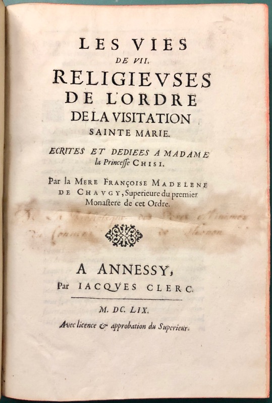 Édition originale. Visitandine à partir de 1629, Françoise Madeleine de Changy fut successivement Supérieure du premier monastère d’Annecy (1647-1653 et 1656-1662), du monastère de Montferrand (1666-1669), de celui de Crest (1671-1673), de celui de Carpentras (1673-1676), et enfin de celui de Turin à partir de 1678. « Instituée historienne de son ordre par Jeanne de Chantal qui la juge brillante, mais peu douée pour la contemplation, Chaugy, morte en 1680, est l’auteure d’écrits destinés, au départ, à ne circuler qu’à l’intérieur des communautés de la Visitation. Il s’agit de faire connaître, à des fins mémorielles et d’édification, les actes et les vertus (les deux moments de tous ces textes) des premières moniales. Mais dès leur publication en 1659, ces recueils biographiques rencontrent un public dévot qui apprécie, comme le font les historien-ne-s d’aujourd’hui, la plume alerte et l’intelligence d’une narratrice précise et enthousiaste. Rédigés sans l’afféterie en vigueur dans les vies spirituelles d’alors (il suffit, pour s’en convaincre, de confronter les textes de Chaugy à la prose qui en dérive) et fondés sur des témoignages authentiques, ces récits ont une valeur documentaire et littéraire indéniable » (Nicole Pellegrin). Provenance : ex-libris armorié de la famille Courtois d’Arcollières (Cortoys d’Arcollières, de Yenne en Savoie) avec la devise Cortoys de nom et de faict. Cioranescu, 18921.
