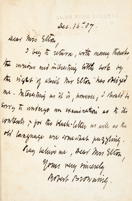 Édition en lettres gothiques batardes de la Veuve Trepperel partagée avec Jehannot, en second tirage distinct du premier tirage par son titre (Les Vigilles du Roy Charles contre S’ensuyt les Vigilles du Roy Charles) et par l’explicit où le nom de Jehannot est mentionné. Précieux exemplaire comportant une lettre autographe en anglais signée du grand poète et dramaturge anglais Robert Browning (1812-1899), datée du 16 décembre 1887 et adressée à Madame Elton pour remercier Monsieur Elton son mari (dont l’ex-libris est collé sur le premier contreplat) de lui avoir confié cet ouvrage dont la lecture lui fut néanmoins difficile. Titre en rouge et noir illustré d’un bois gravé sous-titré Le lis de justice suivi au verso du titre d’un grand bois gravé pleine page représentant Charles VII gisant, ce dernier répété au verso du dernier feuillet. Les Vigiles de Charles VII, long poème composé entre 1477 et 1483 à la louange du feu roi Charles VII comprend neuf psaumes et neuf leçons alternant par groupes de trois. Les psaumes en quatrains d’octosyllabes forment une chronique de la vie de Charles VII (1402-1461), versifiée sur les données des chroniques du héraut Berry et de Jean Chartier, truffée d’exempla empruntés au Livre de bonnes meurs de Jacques Legrand et au Jeu des échecs moralisés de Jacques de Cessoles, traduction de Jean Ferron. Les leçons sorte d’intermèdes lyriques à la chronique, mettent dans la bouche de France, Noblesse, Labour ou Marchandise, les regrets du bon vieux temps ; écrites dans des mètres variés, elles ne manquent pas d’agrément. Le règne de Charles VII qui endura la Guerre de Cent ans, accompagna Jeanne d’Arc, évoquée en ses vers par le chroniqueur Martial d’Auvergne. « La Veuve Trepperel fut associée à son gendre Jean Janot (ou Jehannot) jusqu’en 1517 ; elle aurait publié, seule ou avec son fils, plus de 120 ouvrages » (R. Arbour, Dictionnaire des femmes libraires en France, p. 504). Provenance : Charles Isaac and Mary Augusta Elton ; Charles Isaac (1839-1900), célèbre avocat anglais, antiquaire et politicien, et Mary Elton, sont les auteurs du livre à succès The Great Book-collectors. Maurice Desgeorge (ex-libris), bibliophile lyonnais du début du XXe siècle. Brunet, III, 1483 ; Bechtel, M-166 ; Tchemerzine-Scheler, IV, 582 : « Cette édition (vers 1515) n’est qu’une variante de la précédente (vers 1512). En réalité, les différences au titre et à l’explicit ne justifient aucunement le classement en deux tirages d’une seule et même édition » ; A catalogue of a portion of the library of Charles Isaac Elton and Mary Augusta Elton (Londres, Quaritch, 1891), p. 123.