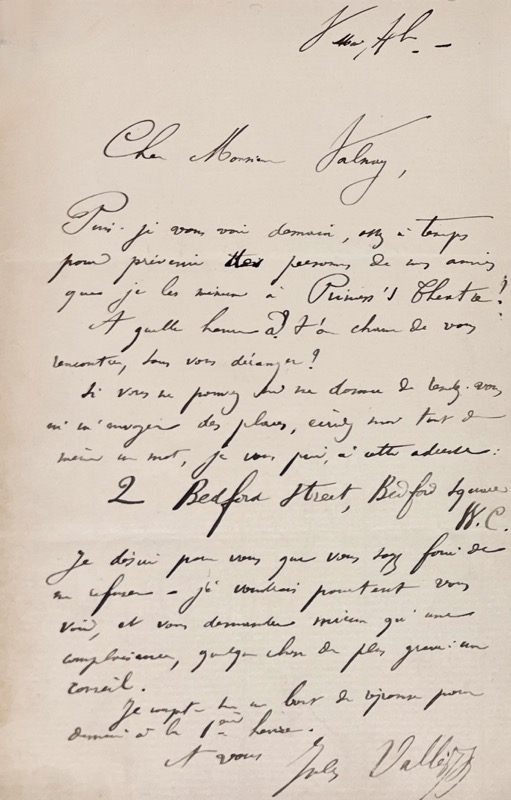 Lettre autographe non datée durant son exil anglais (1871-1880) dont nous n’avons pu identifier le destinataire ; l’adresse en revanche mentionnée dans la lettre 2 Bedford Street renseigne sur sa date approximative (1873) : « Cher Monsieur Jalnay, Puis-je vous voir demain, assez à temps pour prévenir toutes personnes de mes amis que je les … à Princess Theatre ? A quelle heure a-ton chance de vous rencontrer sans vous déranger ? Si vous ne pouvez ni me donner de rendez-vous, ni m’envoyer des places, écrivez-moi tout de même un mot je vous prie à cette adresse : 2 Bedford Street, Bedford Square W.C. … je voudrais pourtant vous voir et vous demander mieux qu’une complaisance, quelque chose de plus grave : un conseil. Je compte sur un bout de réponse pour demain à la première heure. Jules Vallès ».