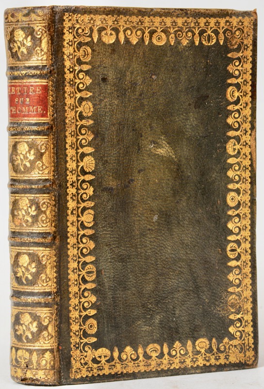 Édition originale rare. Exemplaire imprimé sur grand papier de Hollande. François Hemsterhuis (1721-1790), « le Platon hollandais », s’occupa principalement d’esthétique et de philosophie morale ; attaché au Conseil d’État des Provinces-Unies à La Haye de 1755 à 1780, il se lia à la même époque à la famille Galitzin et sollicita Diderot à propos de sa Lettre sur l’Homme et ses rapports publiée en 1772 – dont le commentaire n’apparaîtra que deux siècles plus tard. « Hemsterhuis voulait, selon ses propres termes, démontrer que « la raison seule (…) ne saurait jamais nous mener aux systèmes de matérialisme et de libertinage ». Apparemment, bien qu’il ne le dît pas explicitement, il tentait de réfuter le Système de la Nature de d’Holbach. La Lettre sur l’Homme et ses rapports était un livre petit, mais très ambitieux. Il était également réactionnaire en ce sens qu’il déplorait dès le début que la liberté de la presse portât préjudice à la morale. Bref, dans un texte lapidaire, Hemsterhuis mettait en question tout ce à quoi Diderot tenait le plus et aimait le plus profondément, si bien que sa réaction est d’une importance capitale pour parvenir à comprendre sa philosophie. Se fondant au départ sur le postulat d’une philosophie idéaliste, Hemsterhuis soulevait vivement mais maladroitement toutes les questions métaphysiques et éthiques qui avaient assailli l’humanité depuis Platon. Pour faire des observations sur ces problèmes, Diderot dut naturellement répliquer sur un front très vaste, et donc le commentaire sur Hemsterhuis nous donne l’occasion d’embrasser d’un seul regard l’ensemble de la philosophie de Diderot » (Wilson). Bel exemplaire de présent ; une note manuscrite ancienne indique « Présent de l’auteur de l’essai sur les Désirs ». Roger Stoddard, A Bibliographical List of Books by François Hemsterhuis (1721-1790) (The Book Collector 2001, 189-201), n°4a ; Wilson, Diderot sa vie son oeuvre, pp. 539-540.