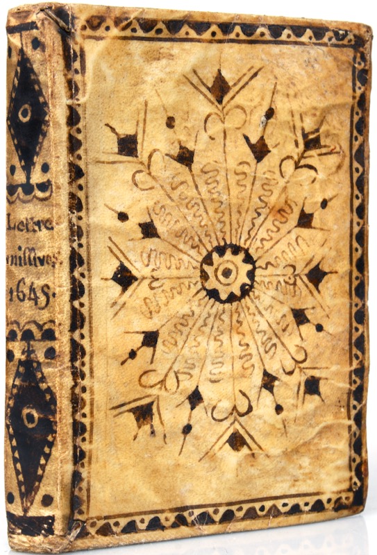 Petit in-8 de 1 feuillet manuscrit, (8)-281 pp., vélin ivoire, dos lisse et plats entièrement recouverts d’un décor géométrique dessiné et peint à l’encre brune, tranches rouges (reliure de l’époque).